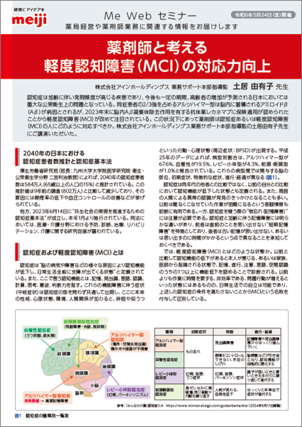 本セミナーでは、株式会社アインホールディングス 業務サポート本部指導監の土居由有子先生を演者に招き、近年改めて注目されている軽度認知障害(MCI)や認知症の解説、またこれらの患者さんに対し、薬剤師はどうのように取り組むべきかについてご講演いただきました。