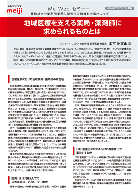 本セミナーでは、ホワイトヘルスケア株式会社 池本 多賀正氏を演者に招き、注目されているテーマを中心に薬局・薬剤師を取り巻く環境と今後期待される役割についてご講演いただきました。