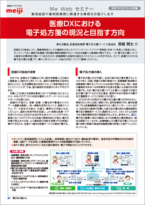 本Webセミナーでは、医療機関等への電子処方箋普及に取り組まれている厚生労働省の長嶋 賢太氏より、医療DXにおける電子処方箋の位置づけ、導入に伴うメリット、今後の方向についてご講演いただきました。