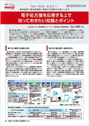 本セミナーでは、電子処方箋モデル事業地域の薬局にてご経験を積まれている株式会社ツルハの白山 祐輝先生を演者に招き、電子処方箋を応需する上で知っておきたい知識や運用する際の注意点についてご講演いただきました。