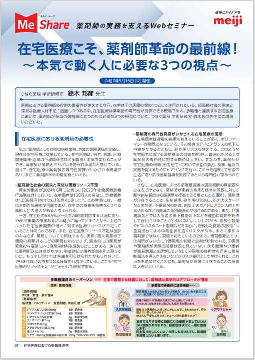 本セミナーでは、つなぐ薬局 学術研修室 鈴木 邦彦先生を演者に招き、医療における薬剤師の重要性や期待が益々高まる中、多職種との連携が大切な在宅医療において、薬剤師が専門性を発揮し革命の最前線に立つために必要な3つの視点(能力)について、ご解説いただきました。