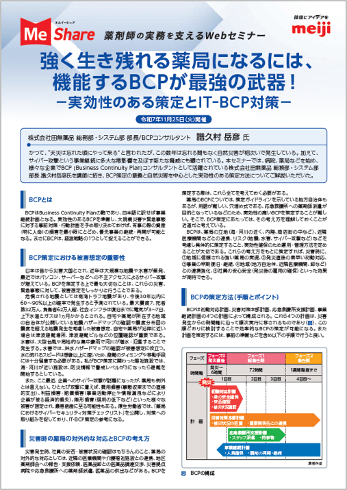 本セミナーでは、株式会社田無薬品 総務部・システム部 部長 譜久村 岳彦 氏を演者に招き、BCPコンサルタントとしての経験をもとに、自然災害・サイバー攻撃による被害想定の重要性やBCPの考え方、実効性の高いBCP策定の流れやポイントについてご講演いただきました。
