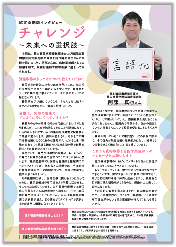 日本糖尿病療養指導士・糖尿病薬物療法認定薬剤師の資格を持ち、病院薬剤師としてのご経験を経て、現在は薬局で在宅医療に関わりご活躍される阿部真也先生にお話を伺いました。