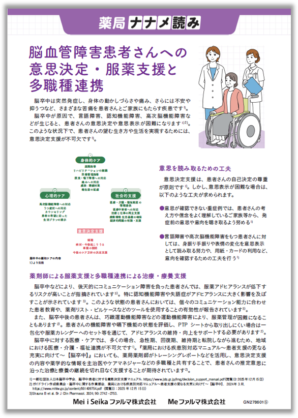 脳卒中が原因で、言語障害、認知機能障害、高次脳機能障害などが生じると患者さんの意思決定や意思表示が困難になります。また、認知機能障害や失語症などの後天的コミュニケーション障害や巧緻運動機能障害などの運動障害を負った患者さんは、意思決定、服薬アドヒアランスが低下するリスクが高くなることが示されています。ここでは、脳卒中に対する医療ケアの中で、薬剤師による意思決定支援、服薬支援と多職種連携による治療・療養支援についてご紹介します。