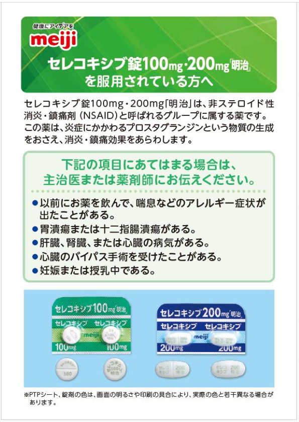 セレコキシブ錠「明治」をご使用の患者さんにお渡しください。