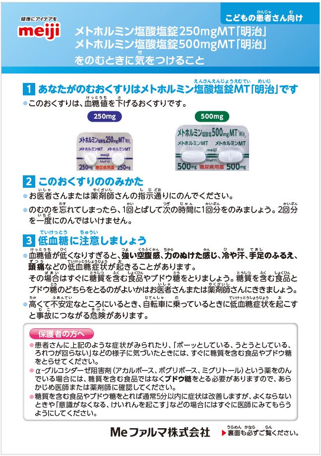 メトホルミン塩酸塩錠MT「明治」をご使用の患者さんや保護者の方にお渡しください。