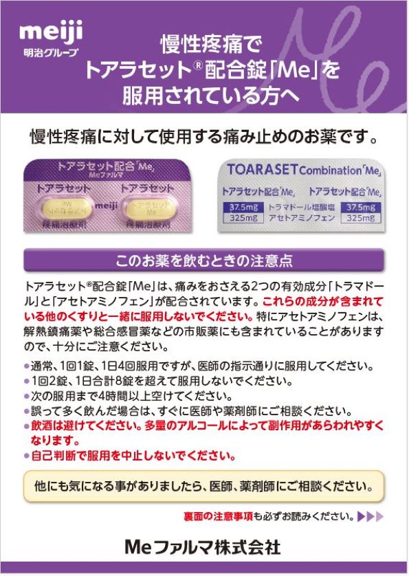 トアラセット配合錠「Me」をご使用の患者さんにお渡しください。