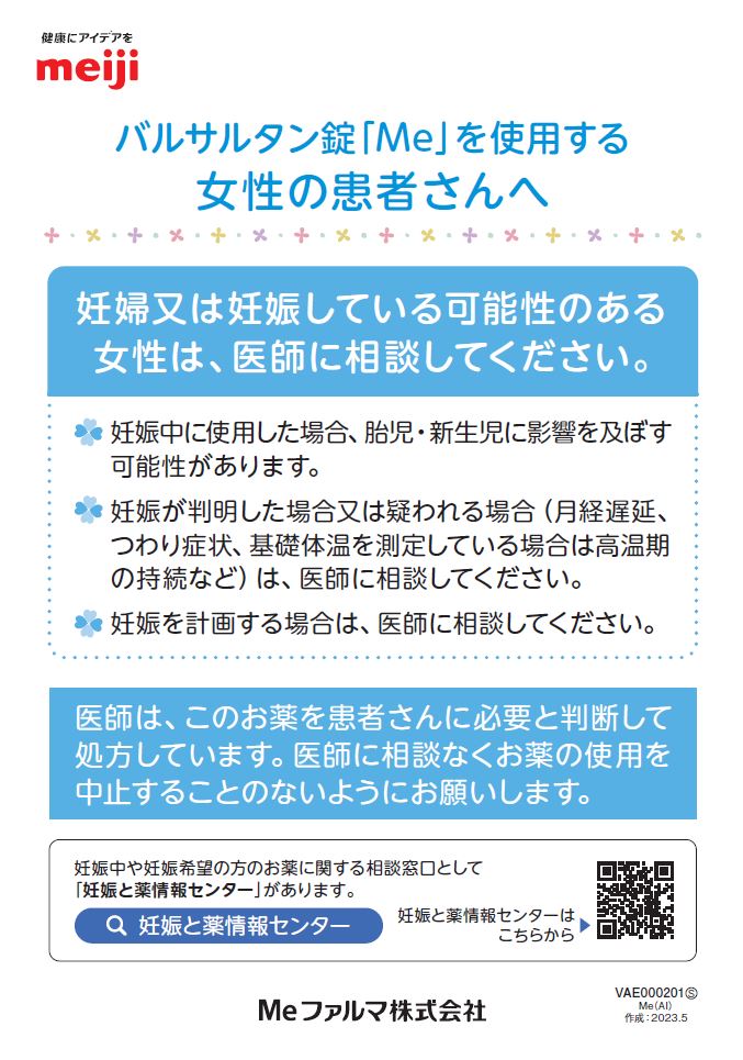 バルサルタン錠「Me」をご使用の患者さんにお渡しください。